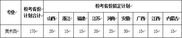 我校2018年美术类专业拟在湖南、山西、浙江、福建、江苏、河南、安徽、广西、江西、内蒙古等省份招生。校考省份拟定计划见下表,湖南等承认省统考成绩省份招生计划另行公布,具体招生计划详见各省(区、市)2018年招生计划来源表。