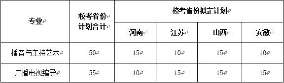 我校2018年播音与主持艺术专业、广播电视编导专业拟在湖南、河南、江苏、山西、安徽等省份招生。校考省份拟定计划见下表,湖南等承认省统考成绩省份招生计划另行公布,具体招生计划详见各省(区、市)2018年招生计划来源表。